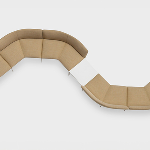 Element narożny 120° wykonany jest z bardzo wygodnej i nieodkształcalnej pianki poliuretanowej, spoczywającej na platformie ze sklejki pokrytej tkaniną, podniesionej 3 cm nad ziemią na małych nóżkach. Poduszka oparcia dodatkowo zwiększa komfort sofy, zapewniając skuteczne wsparcie lędźwiowe. Tapicerka jest zdejmowana, co ułatwia czyszczenie i konserwację. System łączących haczyków umożliwia demontaż i rekonfigurację sofy, dostosowując ją do ewolucji przestrzeni.